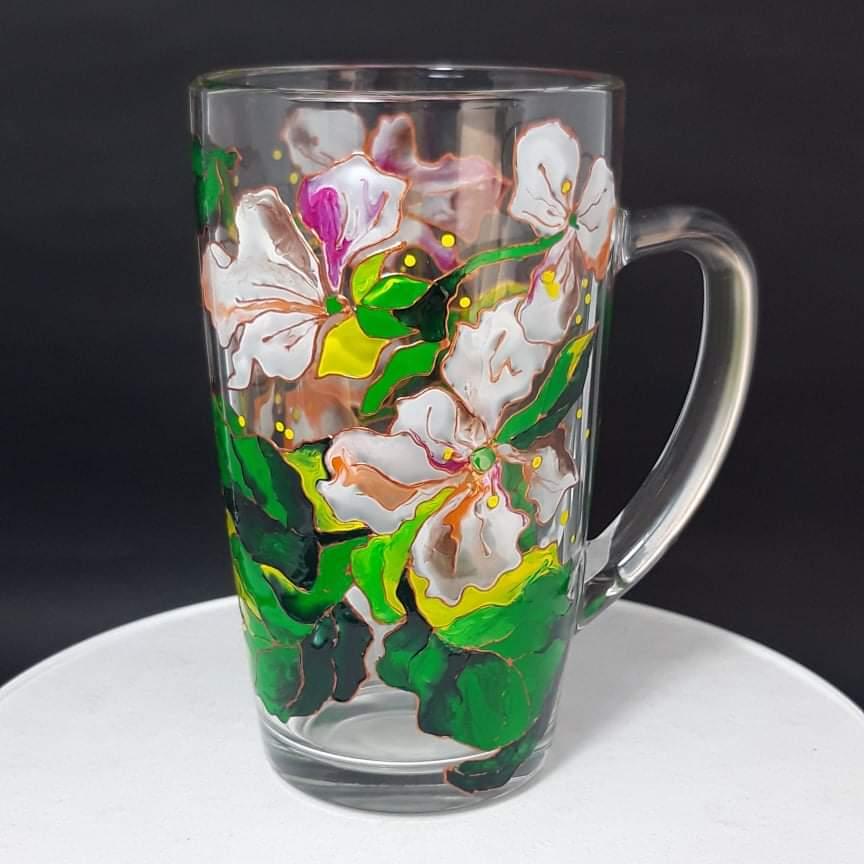 Чашка "Яблуневий цвіт" 430 мл з вітражним розписом ручної роботи від майстра Інни Вишневської. Техніка - вітражний розпис по склу. Посуд розписана вітражним розписом цікава і унікальна. Вона прекрасна сама по собі так і в поєднанні з іншими видами мистецтва .Прекрасно виглядає як в окремих предметах, так і в цілих сервізах або наборах .Багато її минуле та безмежні її перспективи в народженні краси і високого витонченого смаку. Чашка з вітражним розписом подарує вам естетичне задоволення та чудовий настрій. Ця посуд може прикрасити ваш дім і бути прекрасним подарунком дорогим і улюбленим людям. Можливі індивідуальні замовлення по вашому малюнку і враховуються всі ваші побажання .Потіште душу красою .