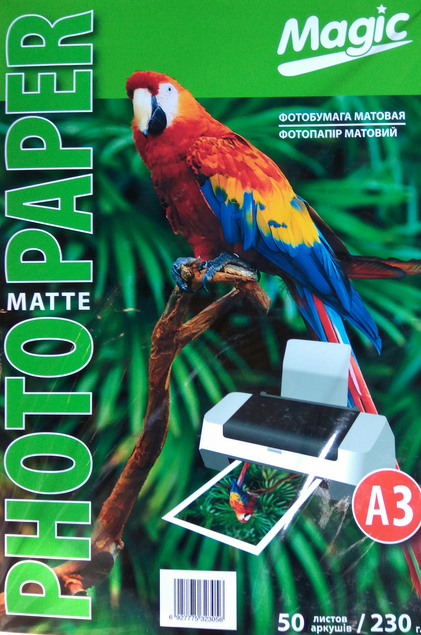 Фотопаперу Magic A3 230g матовий (50 аркушів) можна використовувати як для професійного виробничого використання, так і для домашнього, це вдале поєднання високої якості та прийнятної ціни. Вона має дуже багато переваг, як-от: чітке зображення, багатогранність кольору, насиченість тону, водостійкість відбитка, миттєве висихання чорнила на папері, довге фото та світлостійкість, можливість друку як на пігментних, так і на водорозчинних чорнилах, можливість використовувати в різних сферах та для різних типів печати. На матовому папері краще виглядають високодеталізовані зображення з дрібними деталями. Зазвичай цей вид коштує дешевше, ніж глянець і має підвищену стійкість до відбитків пальців і подряпин. На паперовій основі перший шар, що приймає чорнило, а зверху — матове щільне покриття, яке додає водостійкість відбитку, і шляхетність друку. Матовий папір можна використовувати для: професійного друку фотографій, вивісок, рекламних плакатів, афіш, брошур, інтер'єрної графіки, постерів.Матовий фотопапір формату А3 може використовуватися для друку спеціальних проєктів і великих зображень. Цей тип паперу вигідний і економний варіант, який забезпечить вас якісним, довгострочним, барвистим продуктом і зручним у зберіганні. Ціна матового паперу доступна будь-якому покупцеві, що працює з друкованими пристроями. Запорука якісного фотографування та інших різновидів друку — це відповідний папір, справно підібраний принтер і гідне чорнило.У нашому магазині ви можете придбати різні типи паперу, різного формату та щільності, що містять товари, консультацію , зручний вигляд оплати та доставки, індивідуальний підхід до кожного клієнта.